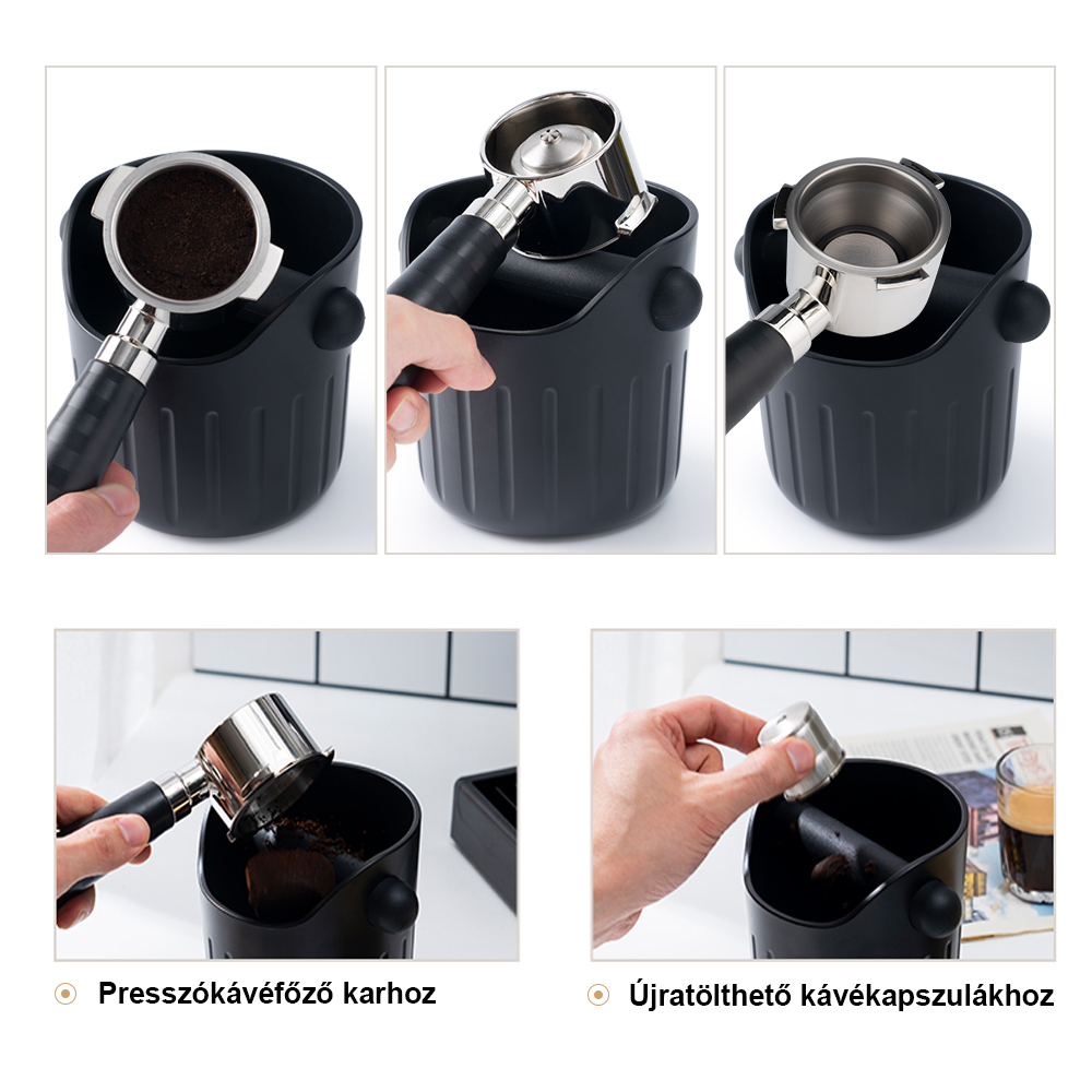 Ez a zacckiütő doboz kényelmes megoldást kínál a frissen főzött kávé után maradt zacc eltávolítására. A kar vagy az újratölthető kávékapszula egyszerűen a gumírozott rúdhoz koppintható, így a kávézacc az edénybe hullik. A stabil alátét pedig segít a biztonságos használatban. A termék mind a profi baristák, mind az otthoni kávérajongók munkáját hatékonyabbá teszi.